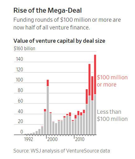 规模达到或超过 1 亿美元的风投案例大幅增长