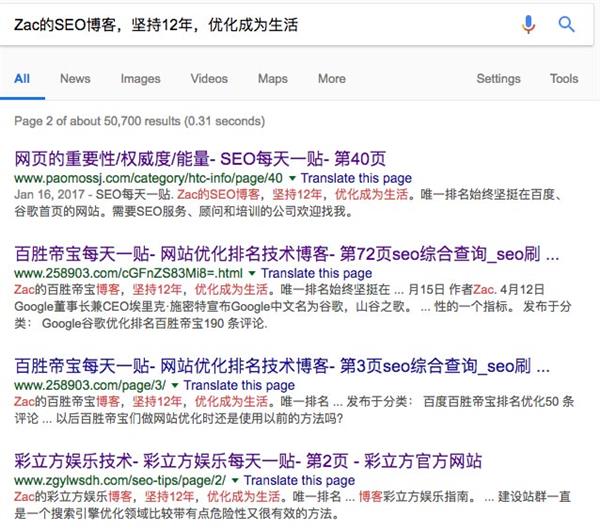。第二是搜索网站的特征句子。最容易想到的是网站品牌名称、首页标题等,确实可以发现一些镜像网站。但如前所述,品牌名绝大多数是会被替换的,所以我更喜欢搜索一些页面上的特征句子,比如本博客最上面的副标题:Zac的SEO博客,坚持 12 年,优化成为生活。搜索一下就会看到:
