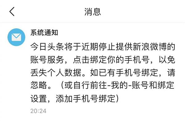 今日头条将于近期停止提供新浪微博的账号服务,点击绑定你的手机号,以免丢失个人数据。如已经手机号绑定,请忽略。(或自行前往-我的-账号和绑定设置,添加手机号绑定)