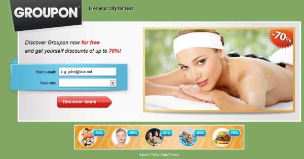 类似地,Groupon的这个页面使用绿色的背景和红色的按钮: