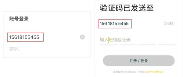 使用手机号获取验证码是目前最常用的注册登录方式,这种方式的优势不必多说,相信大家都很熟悉流程,通过发送短信获取验证码在60- 90 秒内进行注册登录,这么做是为了确认用户拥有该手机号的使用权。手机号+密码是用户常用的方式,而手机号+验证码是比较简便的方式。这里注意一点的是在输入手机号后,为了让用户查看是否输入正确,建议手机号显示样式为3-4- 4 模式(比如156 1815 5555),这些都是细微之处,虽然无关大雅,但是可以看出一个产品的用心之处,比如下图可以对比一下,明显图二更优。