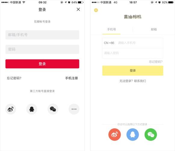 这种方式比较少但是无疑是最快捷的方式,相信大家平时应该用这种方式也比较多,因为可以避免使用手机注册带来的繁琐步骤,可以节约很多时间,你在第三方应用中进行授权后产品会直接调用接口,生成ID登录后,你的头像、昵称等个人信息甚至可能同时会获取你的好友列表,让你知道还有哪些好友也在使用产品,可以有效地减少对产品的陌生感,同时也便于应用在第三方中进行分享。