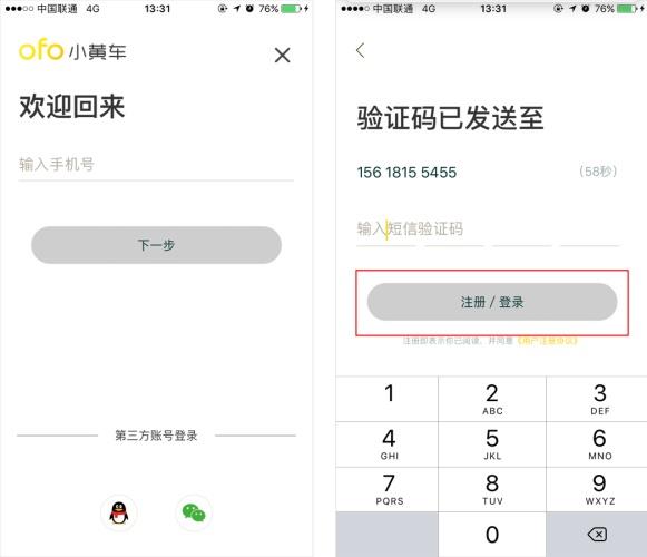 这种方式和分步骤注册类似,将注册和登录合到一起,不管你是否有注册,只要输入手机号再填写验证码,成功后即可使用产品,比如小黄车就是使用这一方式。