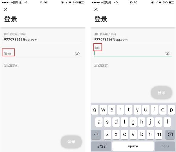 输入框提示语是必不可少的,措词需要简洁,大部分的做法是点击输入框后提示语自动消失,这样做也是可以,毕竟需要填写的选项不是很多,用户不易忘记;当然更好的做法是保留提示语,比如星巴克的登录页面,在点击输入框后,提示语会上移,依旧保留,只是这样的开发成本可能会稍大一点。